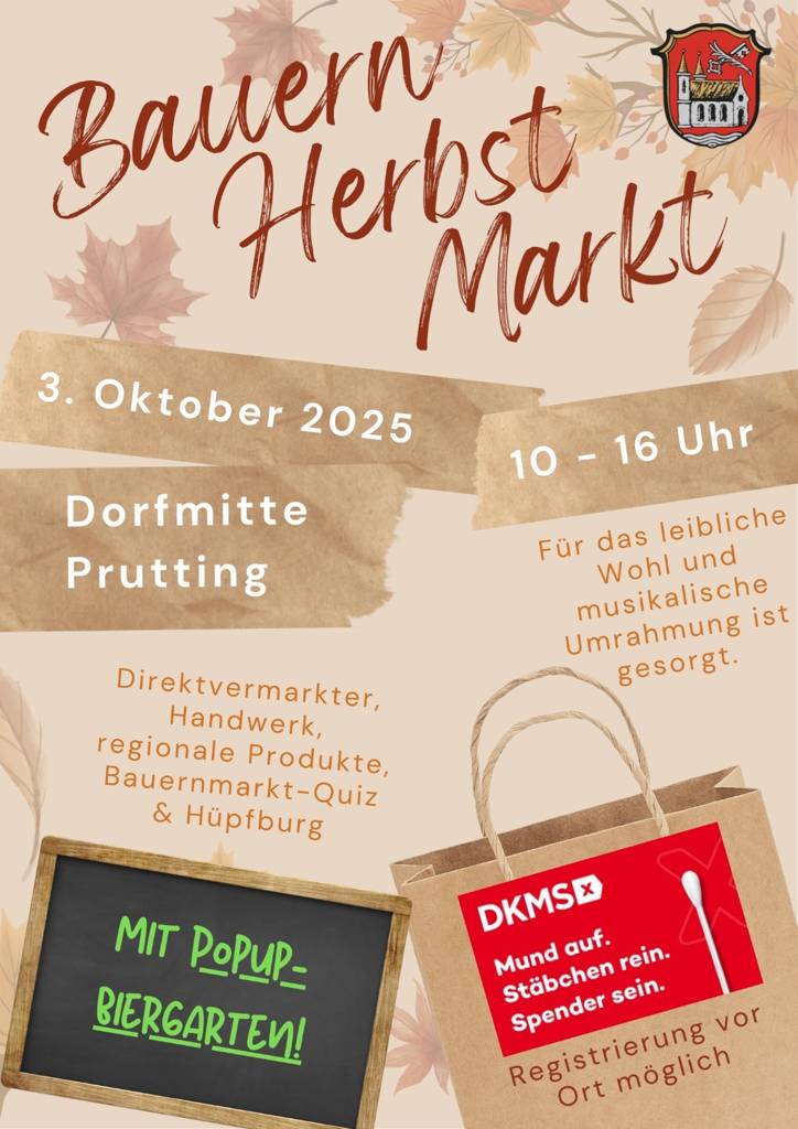 Am Freitag, den 3. Oktober 2025, lädt die Gemeinde herzlich zum traditionellen Bauern-Herbstmarkt in der Dorfmitte Prutting ein. Zwischen 10 und 16 Uhr erwartet die Besucherinnen und Besucher ein vielfältiges Programm für die ganze Familie. Regionale Direktvermarkter und Handwerker präsentieren ihre Produkte, dazu gibt es ein spannendes Bauernmarkt-Quiz und eine Hüpfburg für die Kinder. Auch für das leibliche Wohl ist bestens gesorgt – kulinarische Schmankerl und eine musikalische Umrahmung schaffen eine gemütliche Atmosphäre.